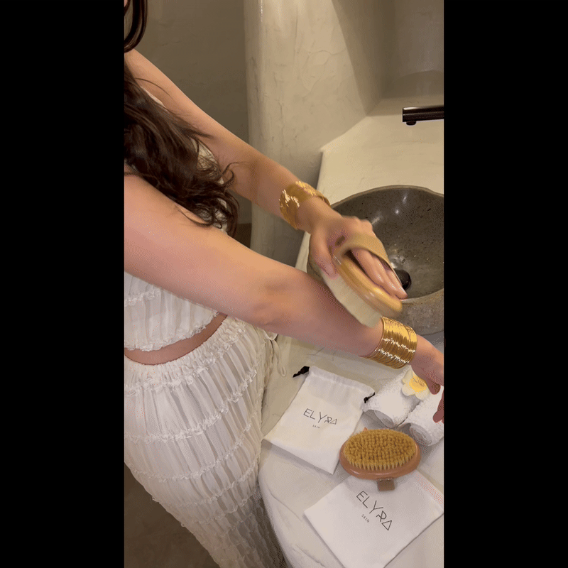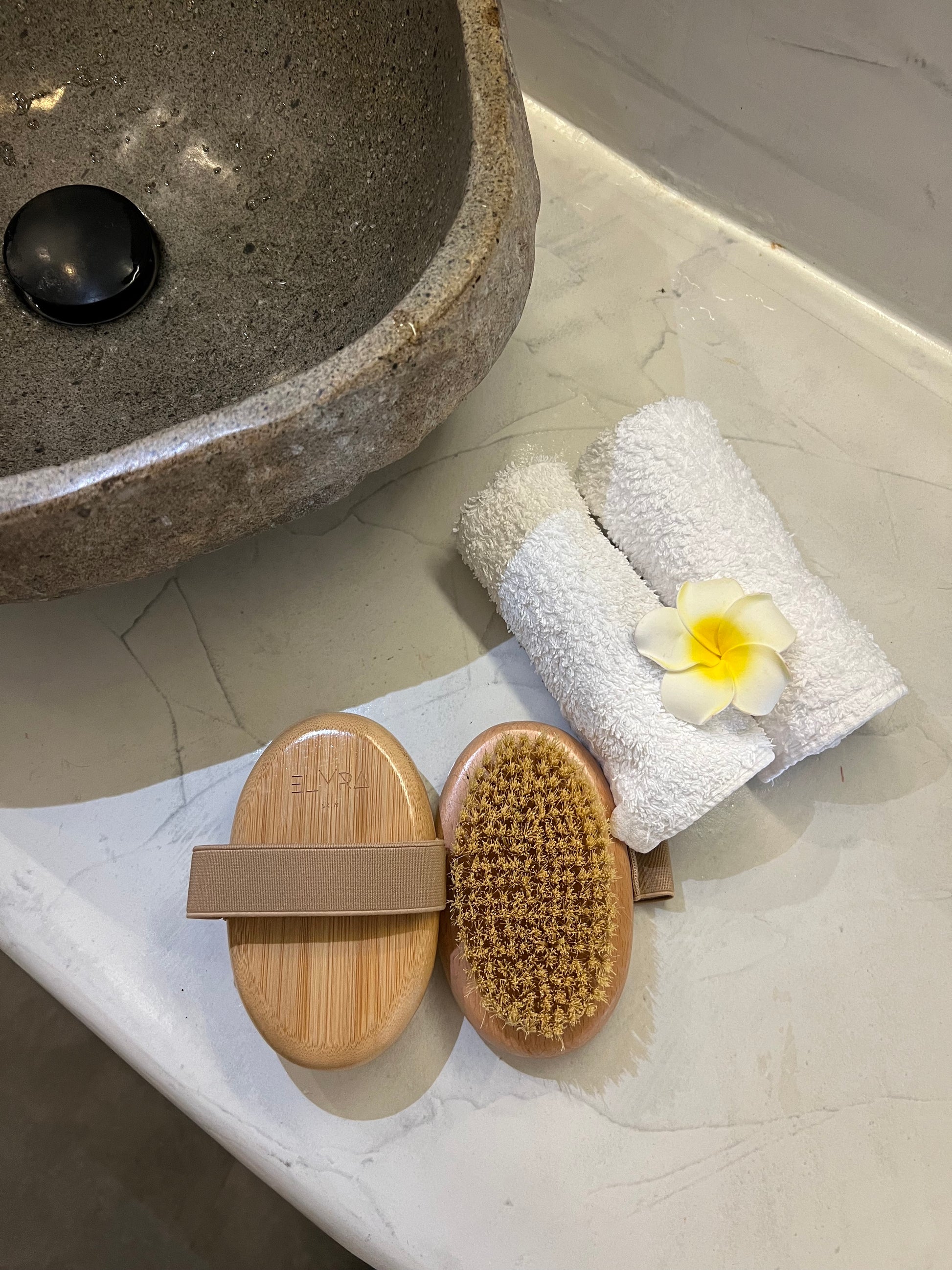 Le brossage à sec est une technique de soin naturelle qui consiste à brosser la peau à l’aide d’une brosse en fibres végétales, sur peau sèche. Ce geste stimule la circulation, lisse la peau et favorise le drainage lymphatique.